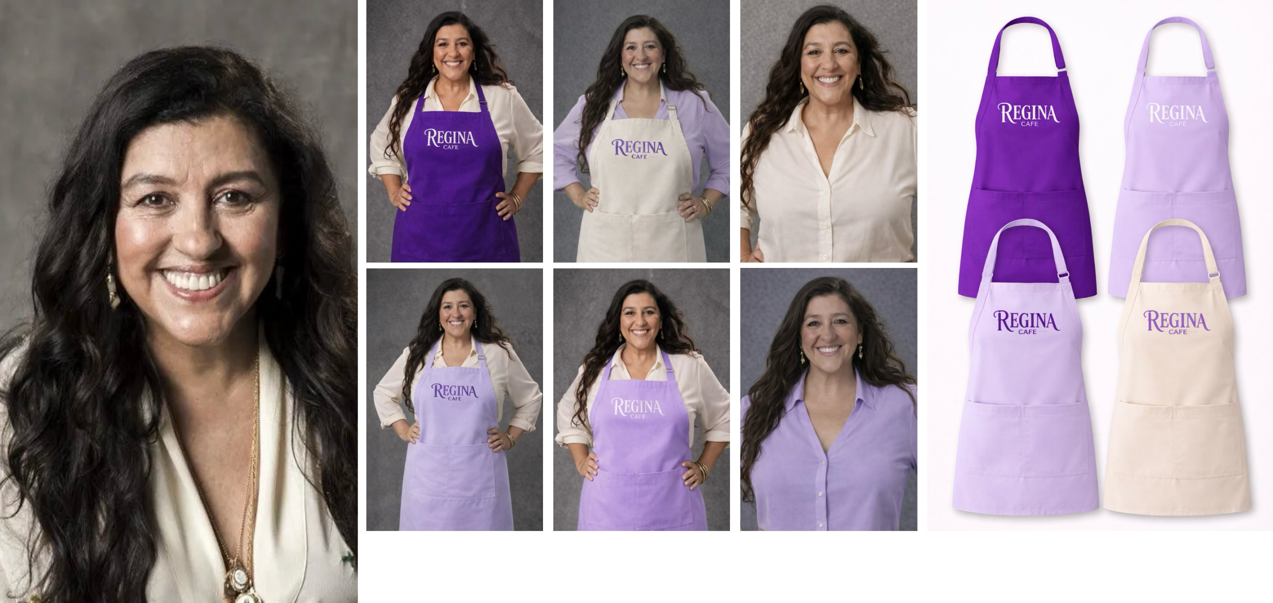 O figurino parte do uniforme do Regina Café, com camiseta e avental com logo aplicado, como extensão natural do espaço e da personagem que ela ocupa ali. Tudo deve parecer real e coerente com alguém que recebe pessoas todos os dias atrás do balcão.